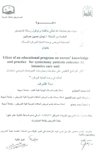 By God willing, the protocol of master thesis submitted by researcher/ Eman Hussien Hassanean – Nursing Specialist, will be discussed on Wednesday, 22/2/2017, at 12:00 noon, at the conference hall of the college.