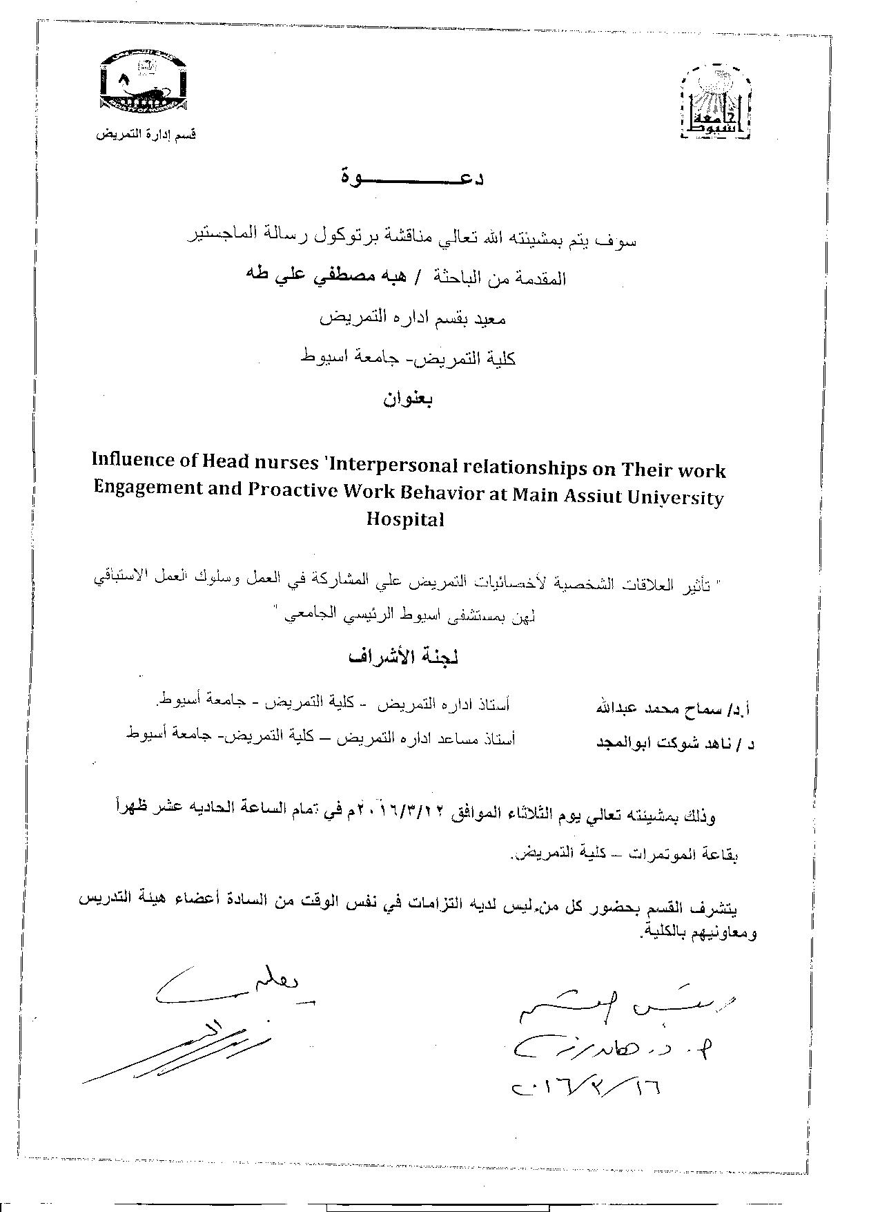 By God willing, The protocol of master thesis submitted by researcher/ Heba Mostafa Ali - demonstrator, Nursing Administration Department, Faculty of Nursing, Assiut University - will be discussed on Tuesday, 22/3/2016, at 11:00 a.m., at the conference hall of the college.