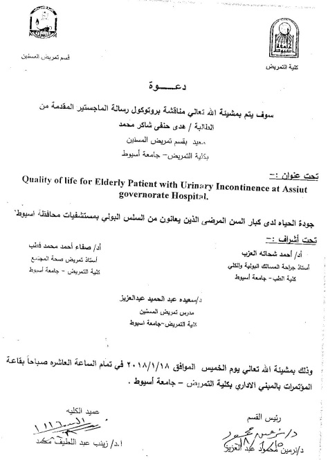 By God willing, the protocol of master thesis submitted by researcher/ Hoda Hanafey Shaker Mohamed- Demonstrator, Geriatric Nursing Department, Faculty of Nursing, Assiut University, will be discussed on Thursday, 18/1/2018, at the conference hall of the college.