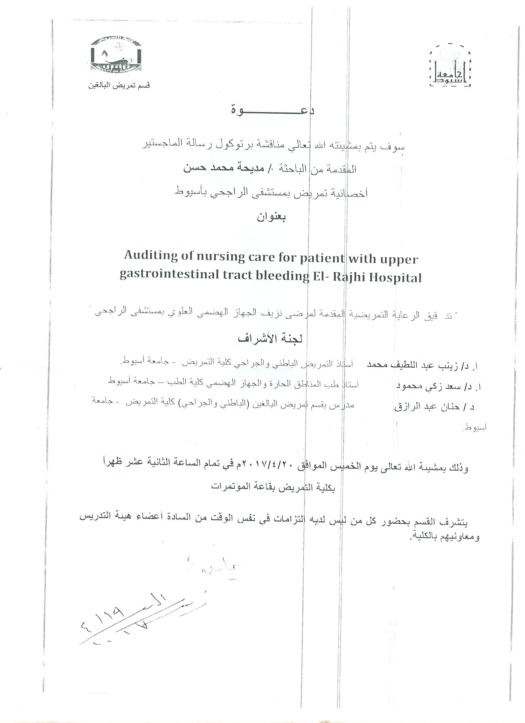 By God willing, the protocol of master thesis submitted by researcher/ Madiha Mohamed Hassan – Nursing Specialist, will be discussed on Thursday, 20/4/2017, at the conference hall of the college.