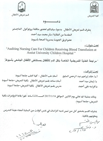 By God willing, the protocol of master thesis submitted by researcher/ Manar Mohamed Sayed Ahmed – Nursing Specialist, will be discussed on Monday, 16/1/2017, at 12:30 p.m., at the conference hall of the college.