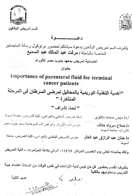 By God willing, the protocol of master thesis submitted by researcher/ Mervat Abdel-Malek Abdel-Samie, Nursing Specialist, South Egypt Cancer Institute will be discussed on Thursday, 4/1/2018, at the conference hall of the college.