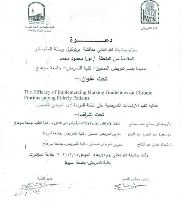 By God willing, protocol of master thesis submitted by researcher/ Nora Mahmoud Mohamed- demonstrator, Geriatric Nursing Department, Faculty of Nursing, Sohag University- will be discussed on Wednesday, 15/1/2020, at the conference hall of the college.