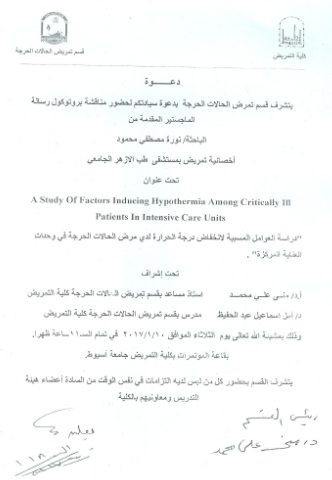 By God willing, the protocol of master thesis submitted by researcher/ Nora Mustafa Mahmoud – Nursing Specialist, will be discussed on Tuesday, 10/1/2017, at 11:00 a.m., at the conference hall of the college.