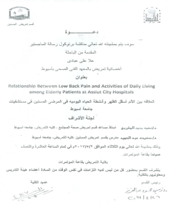 " Relationship between low back pain and activities of daily living amng elderly patients at Assiut city Hospitals "