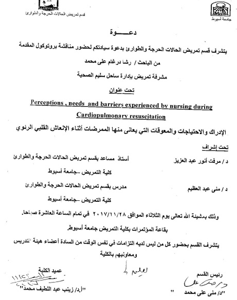 By God willing, the protocol of master thesis submitted by researcher/ Rasha Dergham Ali Mohamed, Nursing Specialist, will be discussed on Tuesday, 28/11/2017, at 10:00 a.m., at the conference hall of the college.