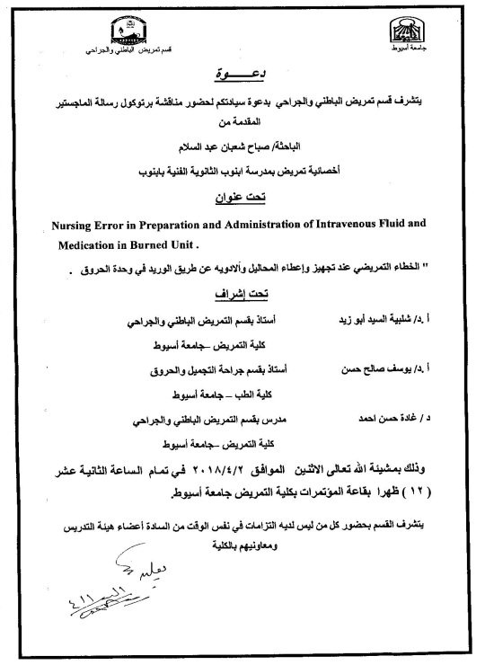 By God willing, the protocol of master thesis submitted by researcher/ Sabah Shaaban Abdel Salam,Nursing Specialist, will be discussed on Monday, 2/4/2018, at 12:00 noon, at the conference hall of the college.