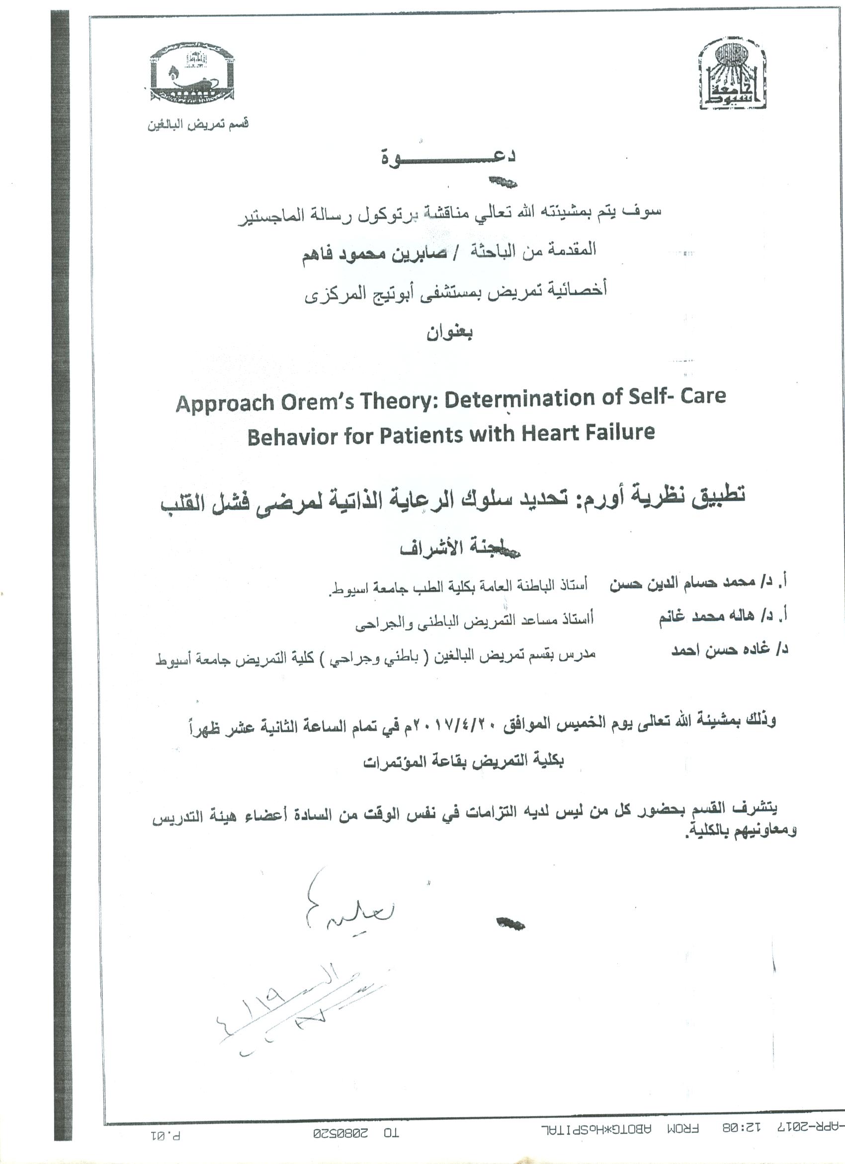 By God willing, the protocol of master thesis submitted by researcher/ Sabreen Mahmoud Fahim – Nursing Specialist, will be discussed on Thursday, 20/4/2017, at the conference hall of the college.