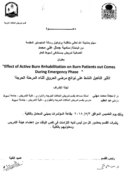 By God willing, the protocol of master thesis submitted by researcher/ Samia Gamal Ali Mohamed, nursing specialist, will be discussed on Thursday, 3/5/2018, at the conference hall of the college. Thesis Title: " Effect of active burn rehabilitation on burn patients out comes during emergency phase "