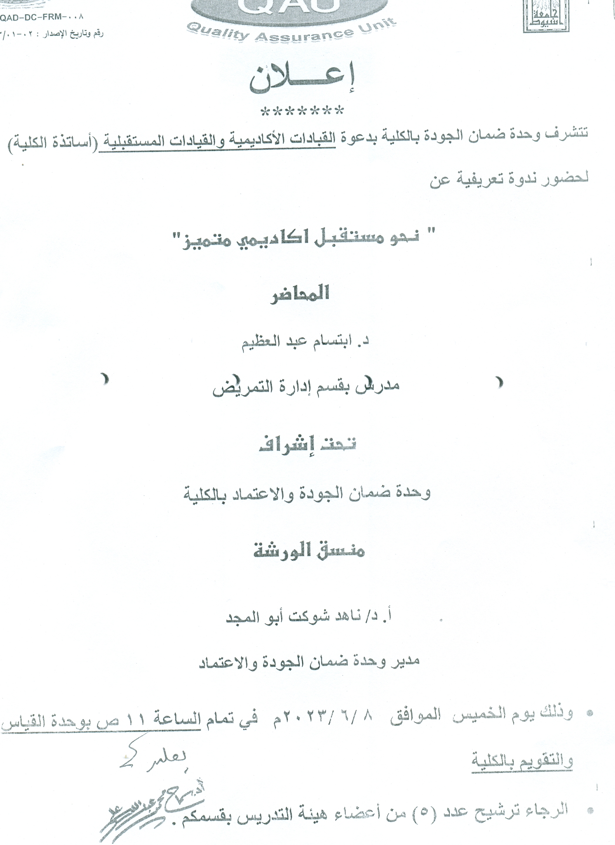 The Quality Assurance Unit of the Faculty is honored to invite academic leaders and future leaders (faculty professors) to attend an introductory seminar on " Towards a distinguished academic future "