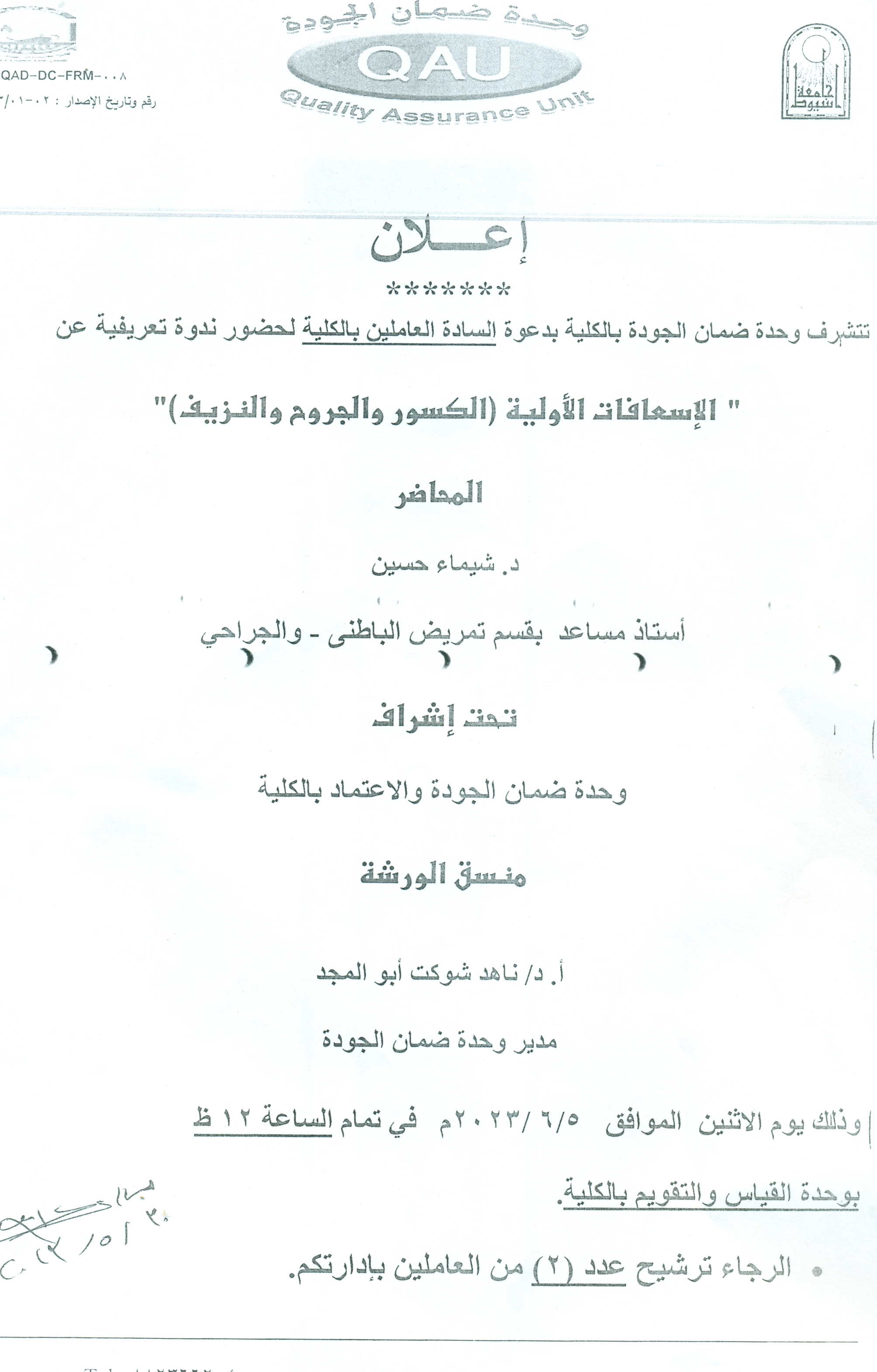 The Quality Assurance Unit of the Faculty is honored to invite the employees to attend seminar on first aid "fractures, wounds and bleeding 4 June 2023