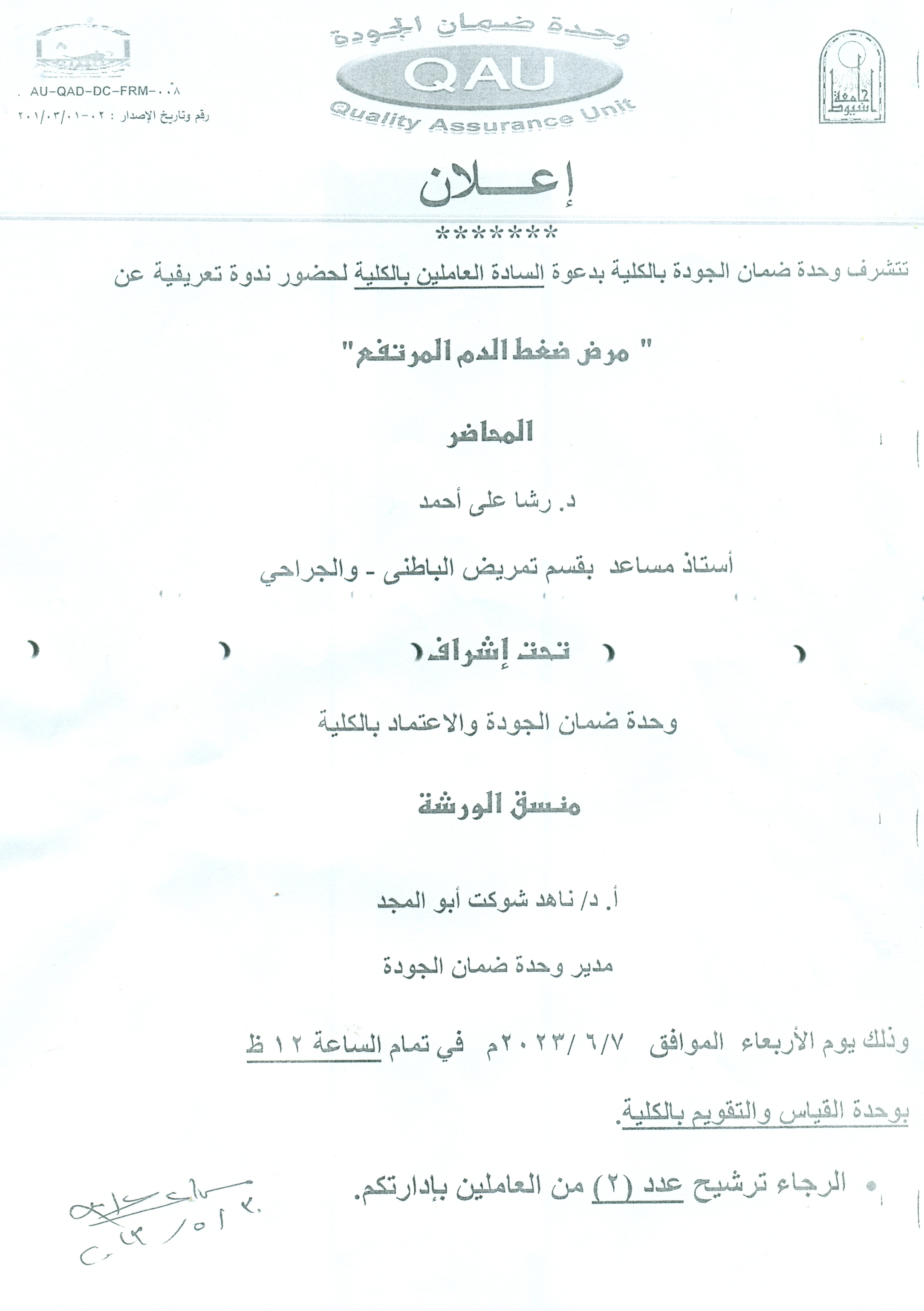 The Quality Assurance Unit of the Faculty is honored to invite the employees to attend seminar on "Hypertension" 4 June 2023