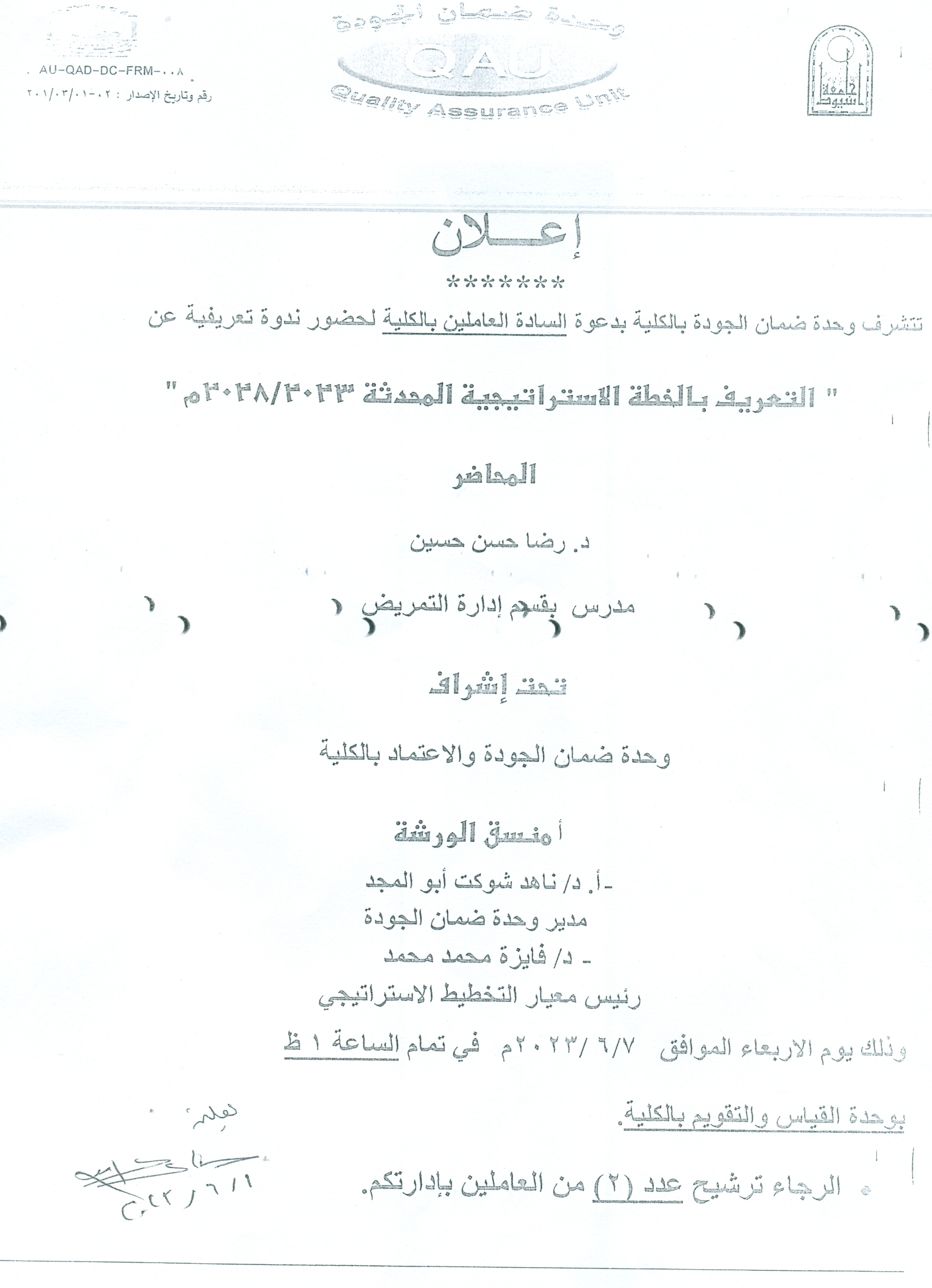 The Quality Assurance Unit of the Faculty is honored to invite the employees to attend seminar on "Introducing the Updated Strategic Plan 2023/2028" 4 June 2023