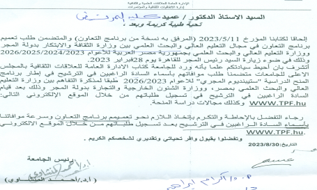 Request to circulate the cooperation program in the higher education and scientific research program between the Ministry of Culture and Innovation in Hungary and the Ministry of Education and Scientific Research in the Arab Republic of Egypt