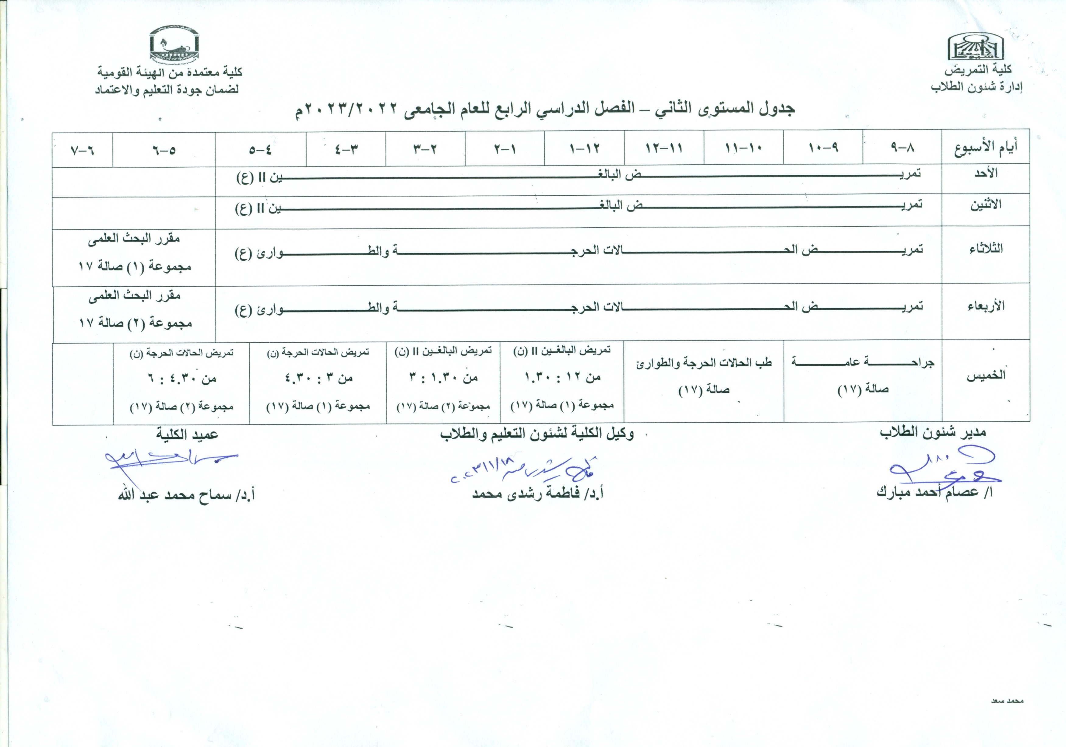 Scedule of the second level (fourth semester) for the second semester of the academic year 2022-2023 AD 6 February 2023