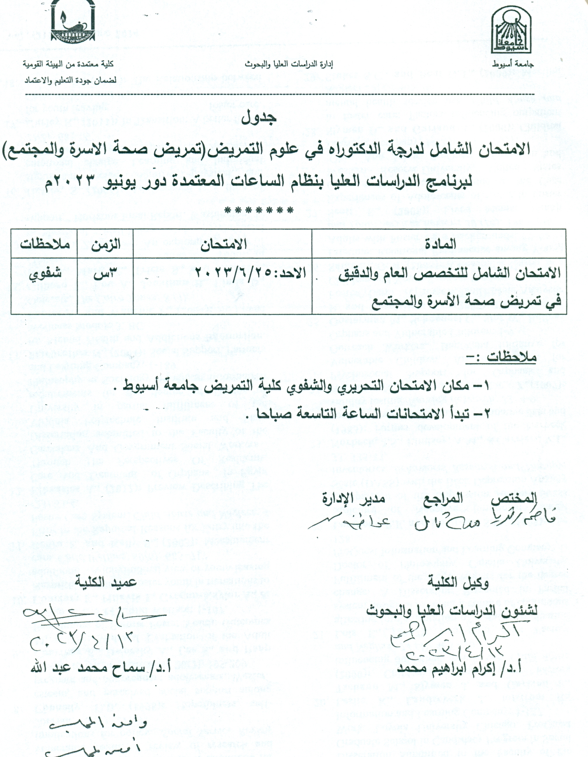 Schedule of the comprehensive examination for the doctoral degree in nursing sciences (family and community health nursing) for the postgraduate program with the credit hour system, June 2023 session