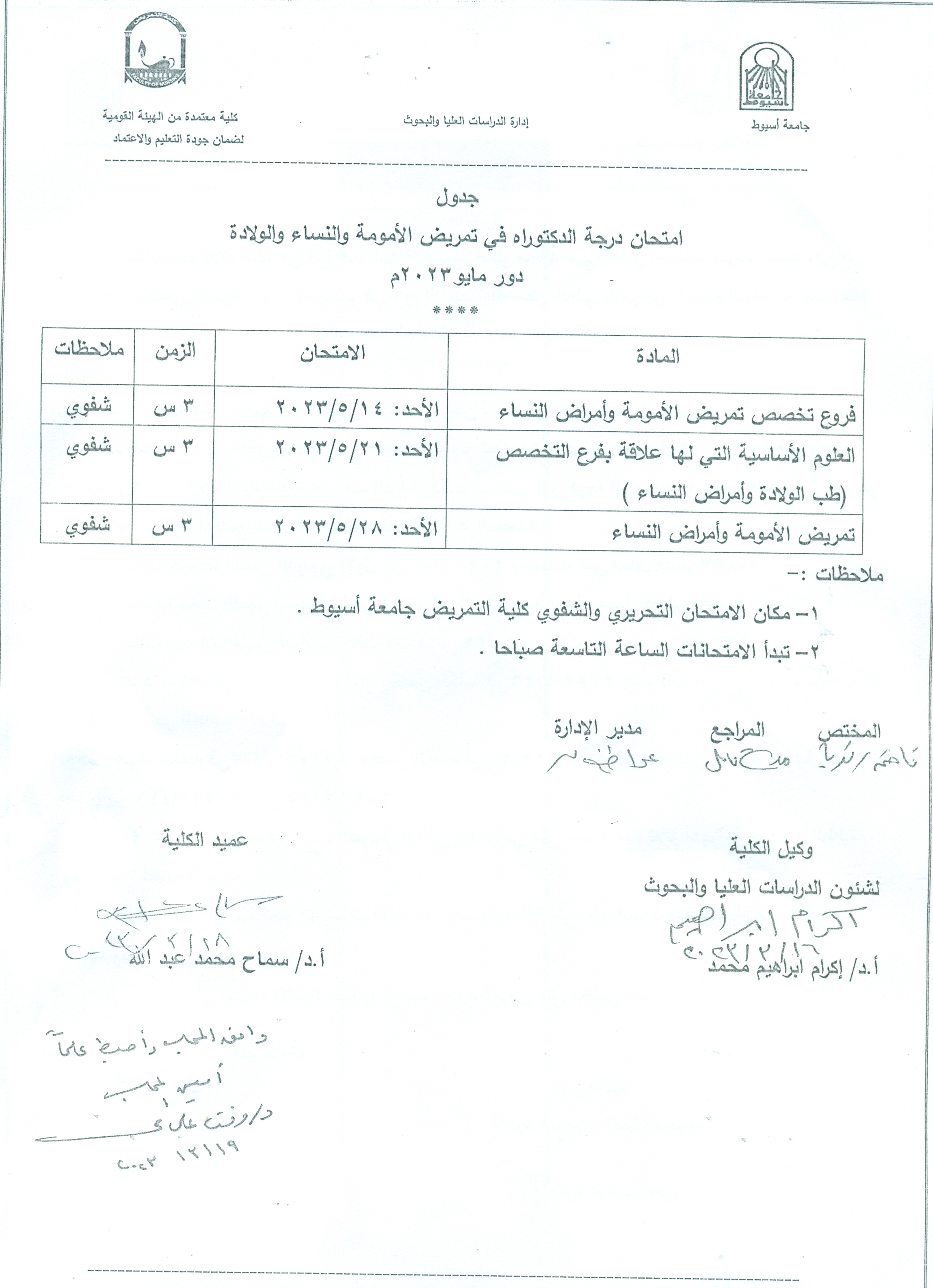 Schedule of doctoral exams in obstetric and gynecology nursing, May 2023