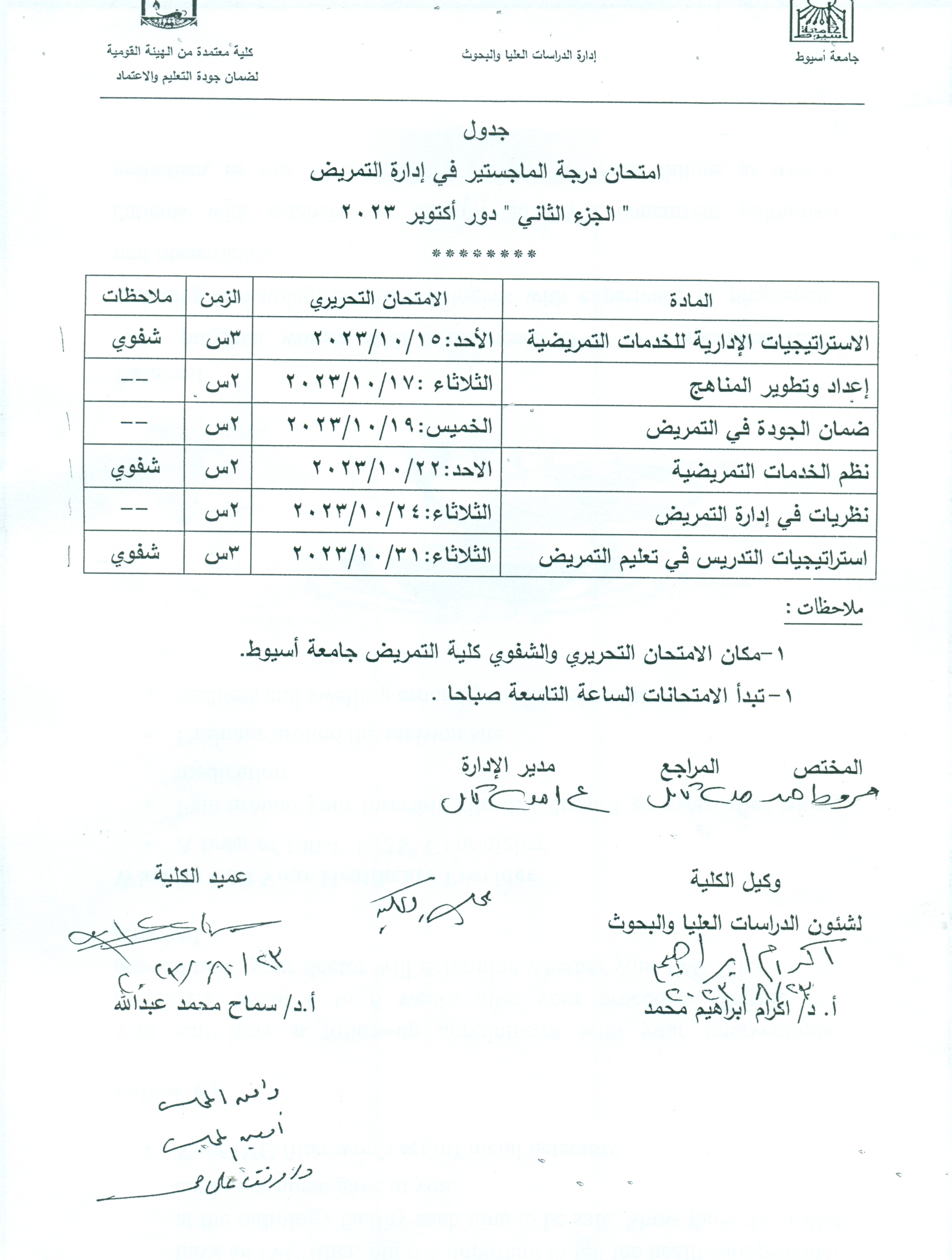 Schedule of the examination for the master’s degree in nursing administration nursing, “Part Two,” October 2023 11 October 2023