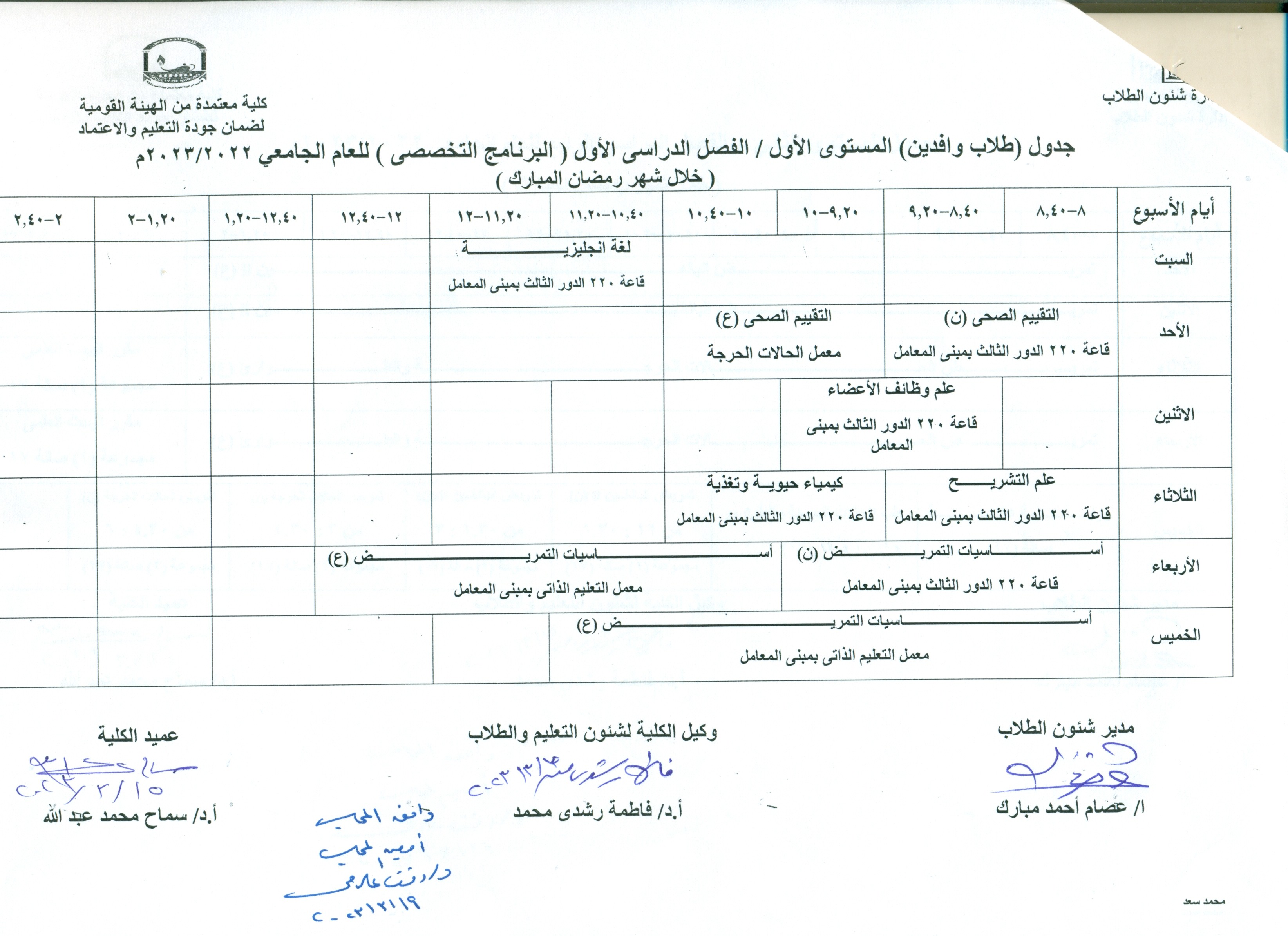 Schedule (international students) for the first level / first semester (specialized program) for the academic year 2022-2023 AD (during the holy month of Ramadan)