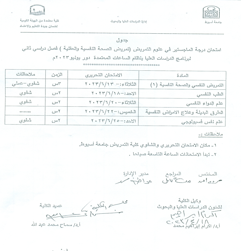 Schedule of the master’s degree exam in nursing science (mental and mental health nursing) for the second semester of the postgraduate program with the credit hour system, June 2023 session