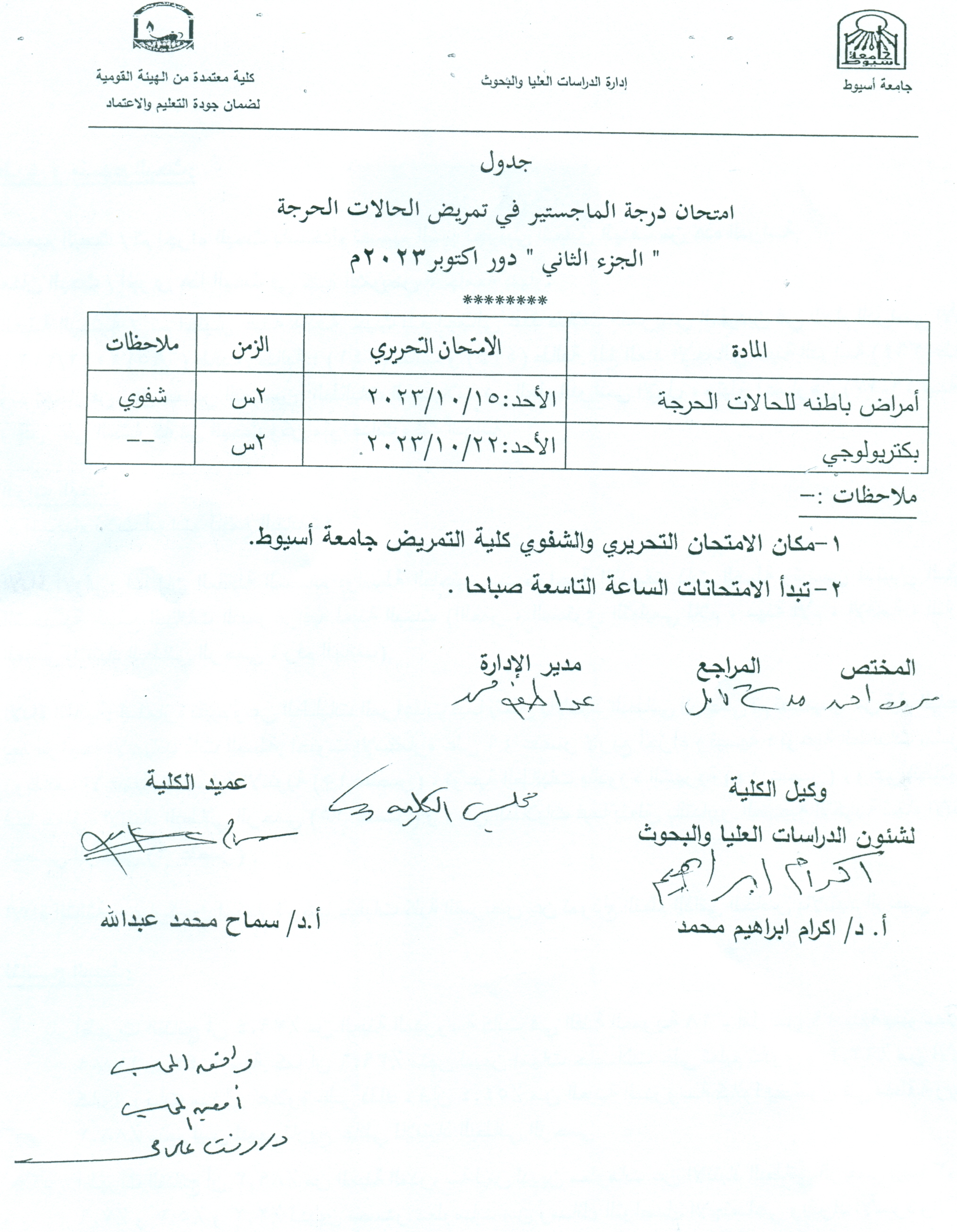 Schedule of the Master’s Degree Examination in Critical Care Nursing, “Part Two,” October 2023 11 October 2023
