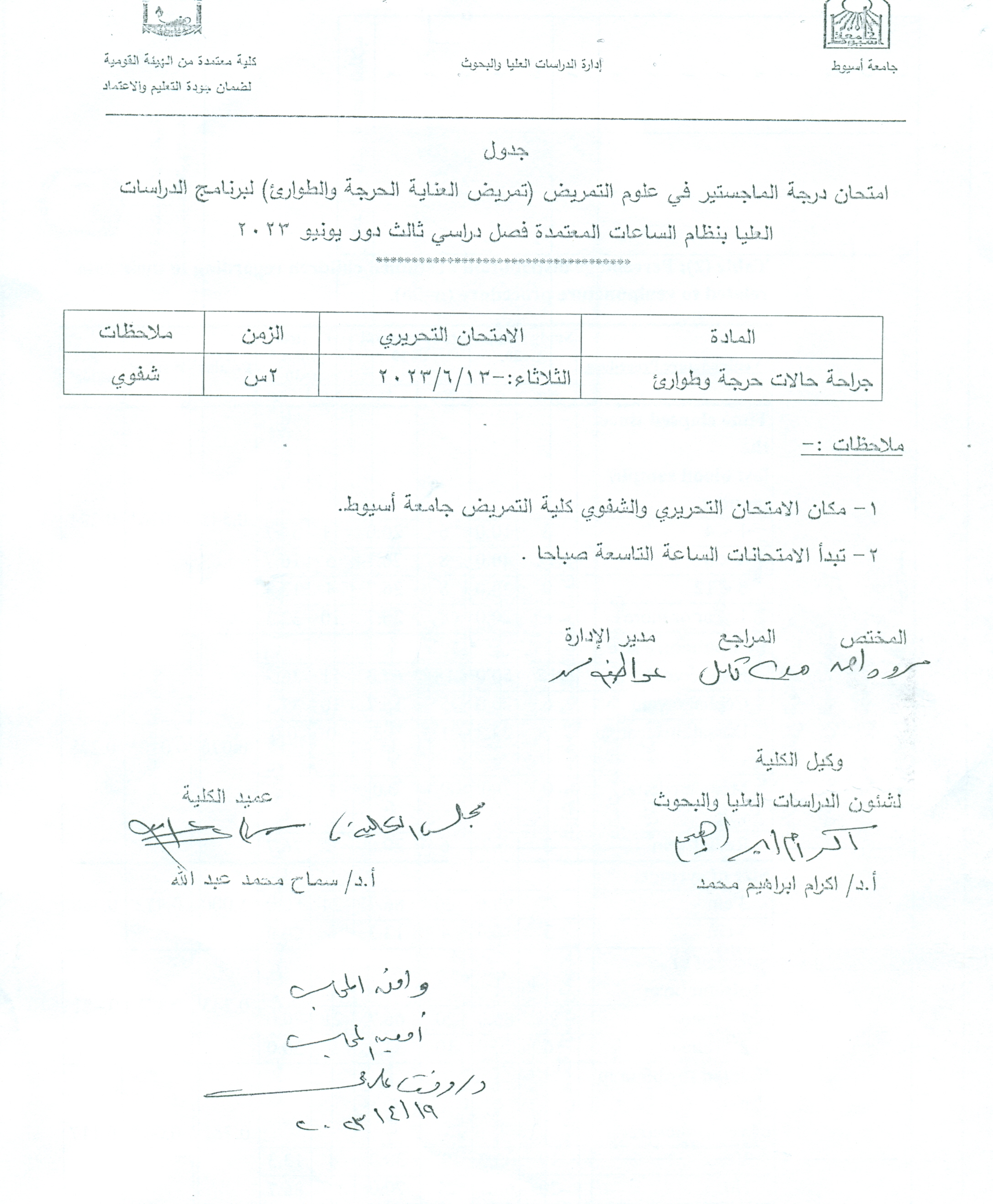 Schedule of the Master’s Degree Examination in Nursing Sciences (Critical Care and Emergency Nursing) for the third semester of the postgraduate program with the credit hour system, June 2023 session