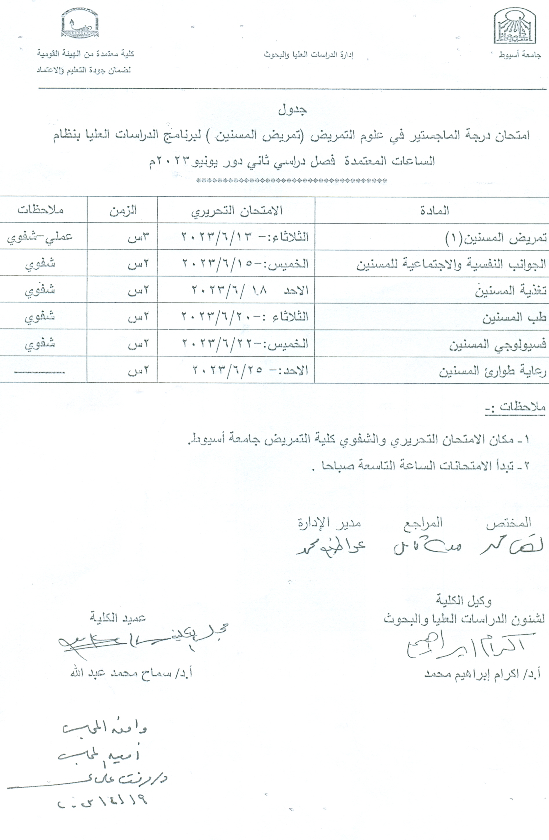 Schedule of the Master’s Degree Examination in Nursing Sciences (Nursing of the Elderly) for the Postgraduate Program with the credit hour system, second semester, June 2023