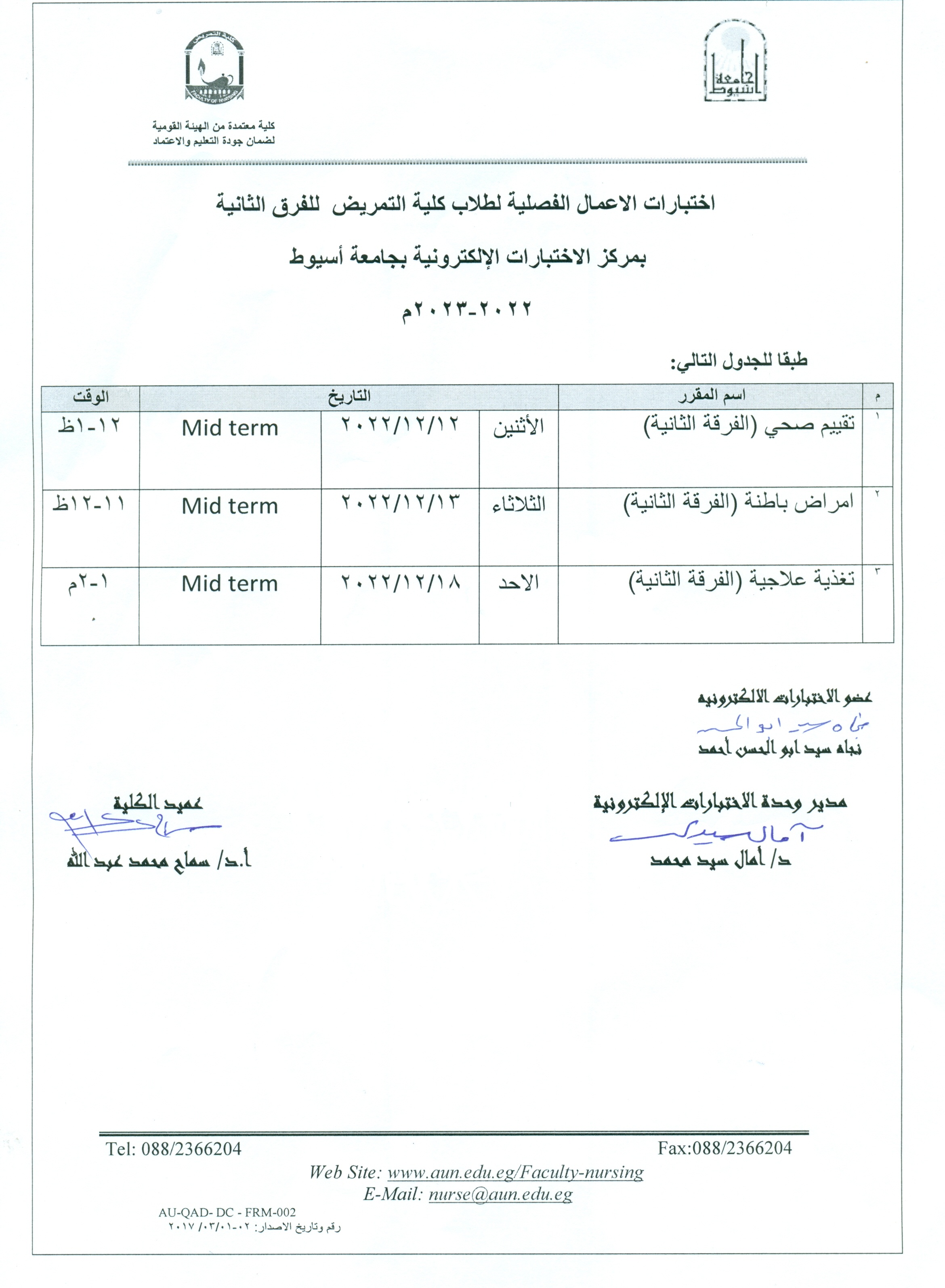 Schedule of midterm exams for students of the Faculty of Nursing for the second year at the Electronic Examination Center, Assiut University 2022-2023 10 December 2022 For the second year at the Electronic Examination Center, Assiut University 2022-2023