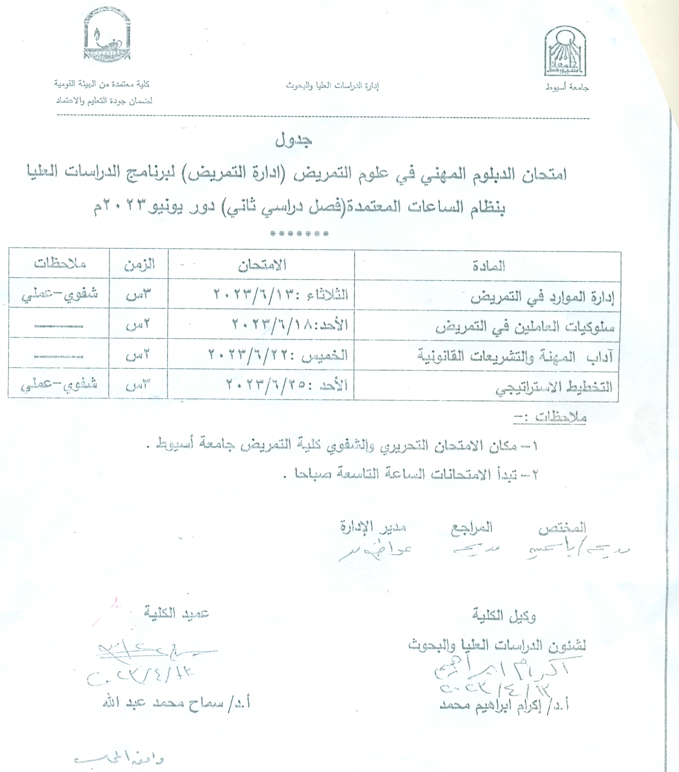 Schedule of the Professional Diploma Examination in Nursing Sciences (Nursing Administration) for the postgraduate program with the credit hour system (second semester) June 2023 session