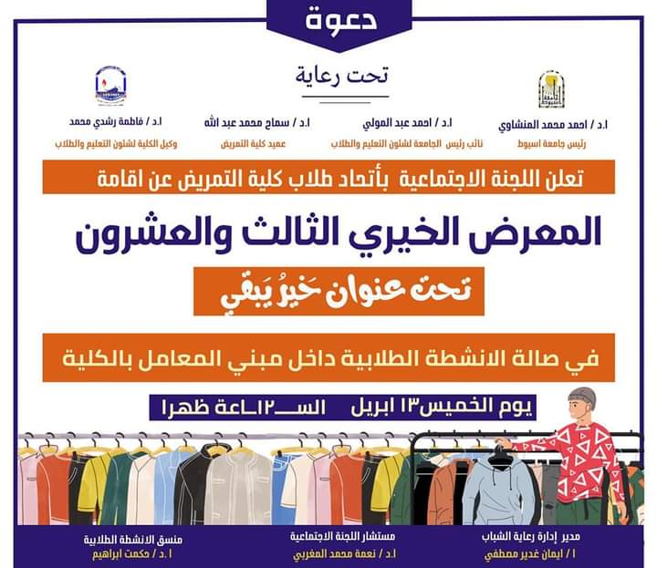 And that will be on Thursday, April 13, in the student activities hall in the laboratory building at twelve noon, under the auspices of Prof. Dr. Ahmed El-Minshawi, President of the University, and Mr. Dr. Ahmed Abdel-Mawla, Vice President of the University for Education and Student Affairs, and the leadership of Mr. Dr. Samah Mohamed Abdullah, Dean of the College, and the supervision of Prof. Dr. Fatima Rushdi Muhammad, Vice Dean for Education and Student Affairs, and Mr. Dr. Mervat Ali Khamis, Vice Dean for Community Affairs and Environmental Development, and organizing the College Student Union Council