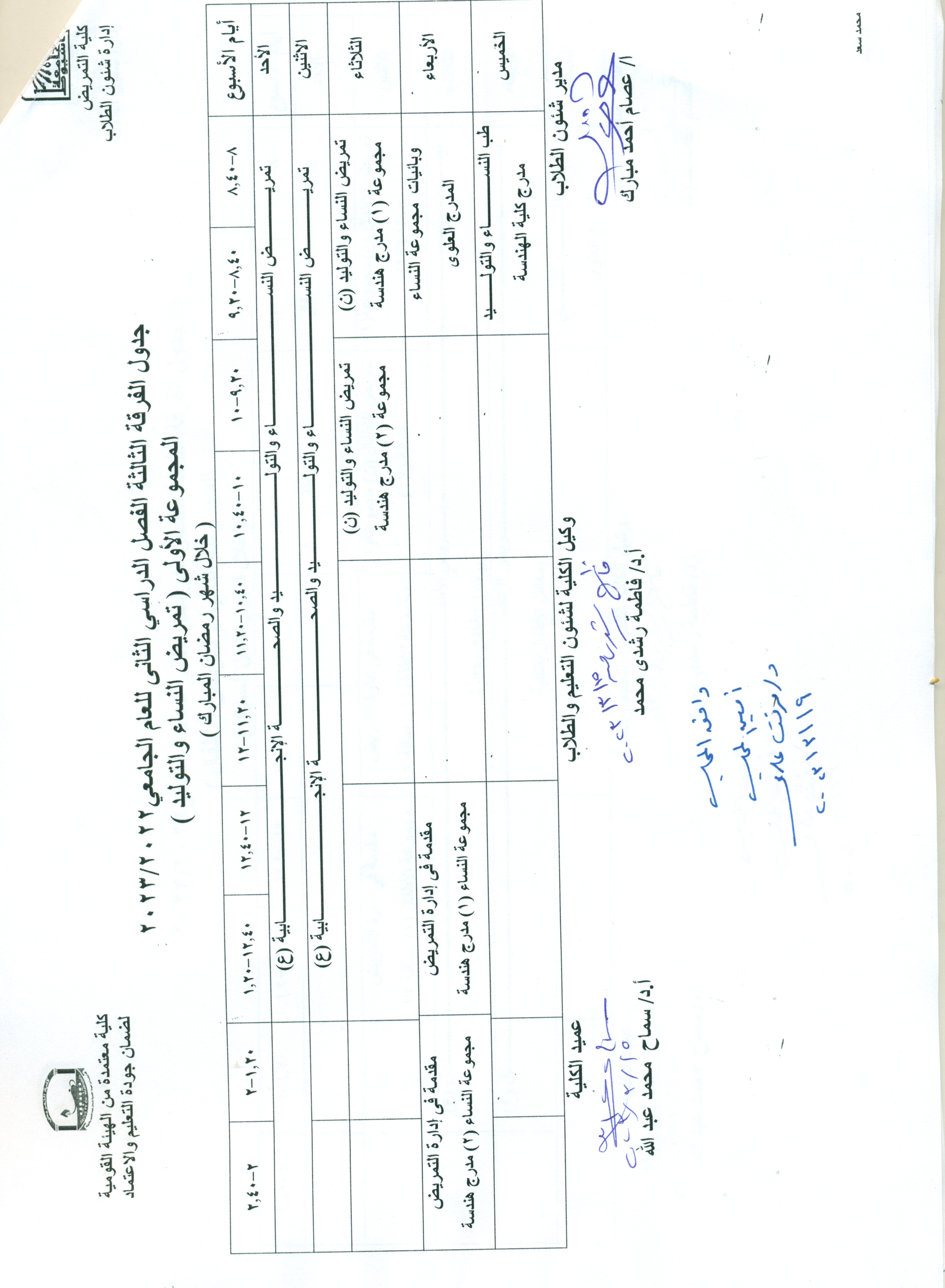 Third year schedule for the second semester of the academic year 2022-2023 AD, the first group (Gynecology and Obstetrics Nursing (during the holy month of Ramadan)