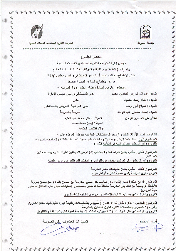 محضر اجتماع مجلس إدارة المدرسة الثانوية للتمريض لمساعدي الخدمات الصحية رقم (16) المنعقد يوم الثلاثاء الموافق 31/3/2015م.