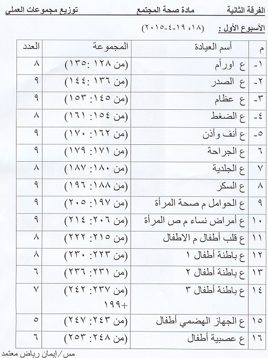 توزيع مجموعات العملى لمادة صحة المجتمع الفرقة الثانية