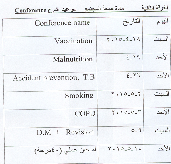 مواعيد شرح conference لمادة صحة المجتمع الفرقة الثانية