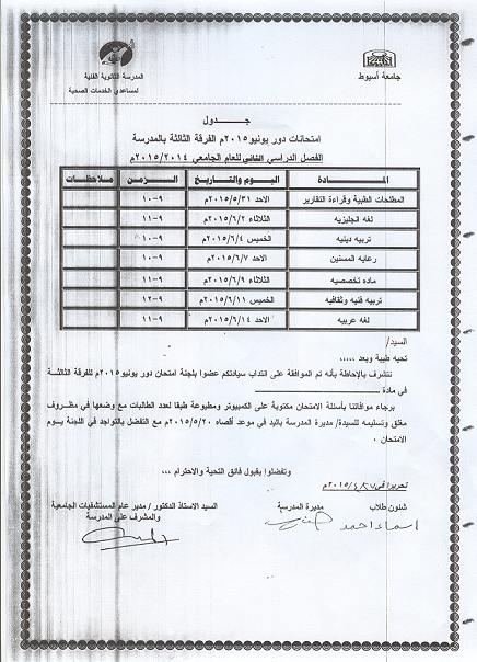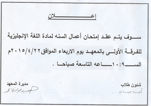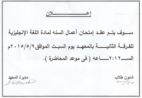 اعلان عن امتحان اعمال السنه لمادة اللغة الانجليزية للفرقة الاولى بالمعهد