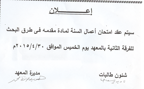 اعلان عن عقد امتحان اعمال السنة لمادة مقدمة فى طرق البحث للفرقة الثانية بالمعهد