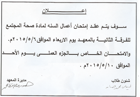 اعلان عن امتحان اعمال السنة لمادة صحة المجتمع للفرقة الثانية بالمعهد Read more about اعلان عن امتحان اعمال السنة لمادة صحة المجتمع للفرقة الثانية بالمعهد اعلان عن امتحان اعمال السنة لمادة صحة المجتمع للفرقة الثانية بالمعهد 30 أبريل 2015