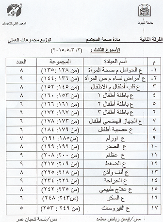 توزيع مجموعات العملى لمادة صحة المجتمع الفرقة الثانية بالمعهد للاسبوع الثالث Read more about توزيع مجموعات العملى لمادة صحة المجتمع الفرقة الثانية بالمعهد للاسبوع الثالث توزيع مجموعات العملى لمادة صحة المجتمع الفرقة الثانية بالمعهد للاسبوع الثالث 30 أبريل 2015