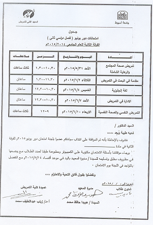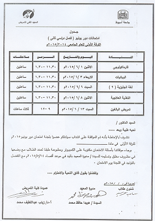 جدول امتحانات دور يونيو للعام الدراسى 2014/2015 الفصل الدراسى الثانى للفرقة الاولى بالمعهد الفنى للتمريض Read more about جدول امتحانات دور يونيو للعام الدراسى 2014/2015 الفصل الدراسى الثانى للفرقة الاولى بالمعهد الفنى للتمريض جدول امتحانات دور يونيو للعام الدراسى 2014/2015 الفصل الدراسى الثانى للفرقة الاولى بالمعهد الفنى للتمريض 6 مايو 2015