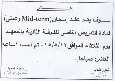 اعلان عن عقد امتحان نصف الترم و العملى لمادة التمريض النفسى للفرقة الثانية بالمعهد Read more about اعلان عن عقد امتحان نصف الترم و العملى لمادة التمريض النفسى للفرقة الثانية بالمعهد اعلان عن عقد امتحان نصف الترم و العملى لمادة التمريض النفسى للفرقة الثانية بالمعهد 6 مايو 2015