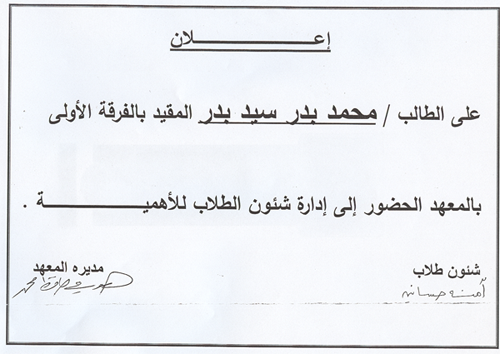 تم حرمان طالب بالفرقة الثانية بالمعهد من دخول امتحانات دور يونيو2015 فى بعض المواد Read more about تم حرمان طالب بالفرقة الثانية بالمعهد من دخول امتحانات دور يونيو2015 فى بعض المواد تم حرمان طالب بالفرقة الثانية بالمعهد من دخول امتحانات دور يونيو2015 فى بعض المواد 10 مايو 2015