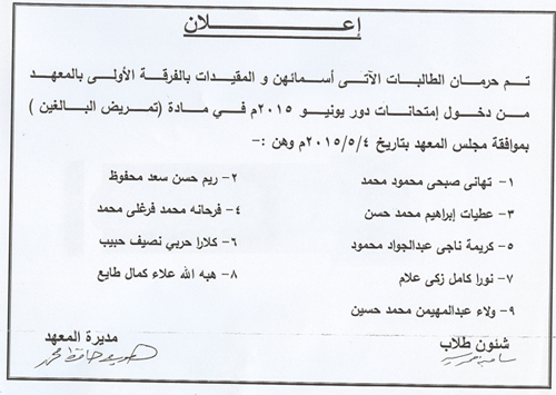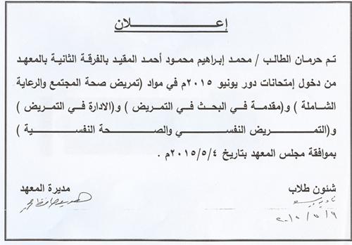 تم حرمان طالبات بالفرقة الاولى بالمعهد من دخول امتحانات دور يونيو 2015 فى مادة تمريض البالغين Read more about تم حرمان طالبات بالفرقة الاولى بالمعهد من دخول امتحانات دور يونيو 2015 فى مادة تمريض البالغين تم حرمان طالبات بالفرقة الاولى بالمعهد من دخول امتحانات دور يونيو 2015 فى مادة تمريض البالغين 10 مايو 2015