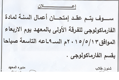 اعلان عن عقد امتحان اعمال السنة لمادة الفارماكولوجى للفرقة الاولى بالمعهد Read more about اعلان عن عقد امتحان اعمال السنة لمادة الفارماكولوجى للفرقة الاولى بالمعهد اعلان عن عقد امتحان اعمال السنة لمادة الفارماكولوجى للفرقة الاولى بالمعهد 10 مايو 2015