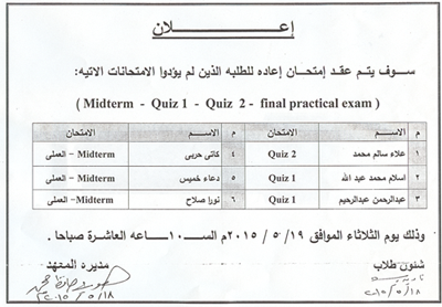 اعلان عن عقد امتحان إعادة للطلبة الذين لم يؤتوا امتحاناتmidterm - Quiz 1 - Quiz 2 - final practical exam Read more about اعلان عن عقد امتحان إعادة للطلبة الذين لم يؤتوا امتحاناتmidterm - Quiz 1 - Quiz 2 - final practical exam اعلان عن عقد امتحان إعادة للطلبة الذين لم يؤتوا امتحاناتmidterm - Quiz 1 - Quiz 2 - final practical exam 18 مايو 2015