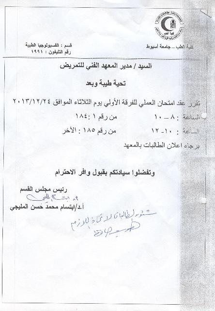 تقرر عقد امتحان العملى فى مادة الفسيولوجيا الطبية للفرقة الاولى يوم الثلاثاء الموافق24/12/2013