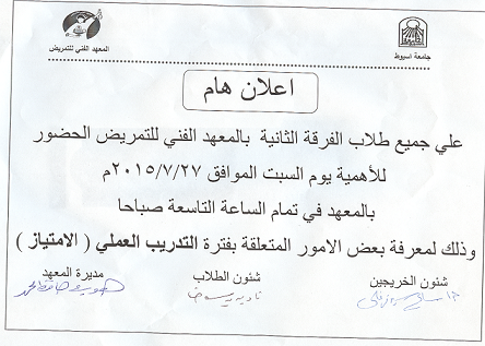 اعلان هام لطلاب الفرقة الثانية بالمعهد Read more about اعلان هام لطلاب الفرقة الثانية بالمعهد اعلان هام لطلاب الفرقة الثانية بالمعهد 21 يوليو 2015