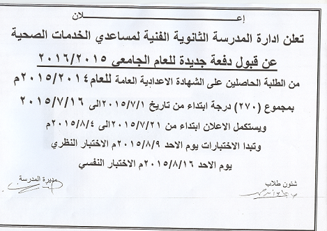 اعلان عن قبول دفعة جديدة من حملة الاعدادية الحديثة (إناث و ذكور) Read more about اعلان عن قبول دفعة جديدة من حملة الاعدادية الحديثة (إناث و ذكور) اعلان عن قبول دفعة جديدة من حملة الاعدادية الحديثة (إناث و ذكور) 22 يوليو 2015
