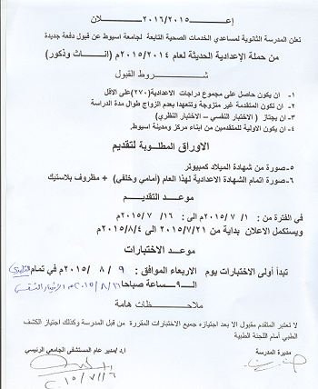 تعلن ادارة المدرسة الثانوية الفنية لمساعدى الخدمات الصحية عن قبول دفعة جديدة للعام الجامعى 2016/2015 Read more about تعلن ادارة المدرسة الثانوية الفنية لمساعدى الخدمات الصحية عن قبول دفعة جديدة للعام الجامعى 2016/2015 تعلن ادارة المدرسة الثانوية الفنية لمساعدى الخدمات الصحية عن قبول دفعة جديدة للعام الجامعى 2016/2015 22 يوليو 2015