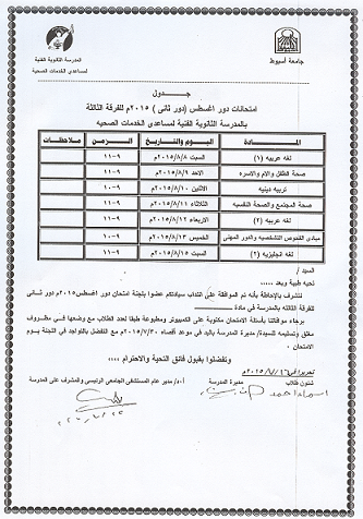 جدول امتحانات دور اغسطس(دور ثانى) للعام الجامعى2014/2015 الفرقة الثالثه بالمدارس الثانويه لمساعدى الخدمات الصحيه Read more about جدول امتحانات دور اغسطس(دور ثانى) للعام الجامعى2014/2015 الفرقة الثالثه بالمدارس الثانويه لمساعدى الخدمات الصحيه جدول امتحانات دور اغسطس(دور ثانى) للعام الجامعى2014/2015 الفرقة الثالثه بالمدارس الثانويه لمساعدى الخدمات الصحيه 5 أغسطس 2015