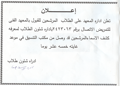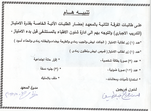على الطلاب الجدد المذكور اسمائهم الحضور يوم الاثنين الموافق 7/9/2015 وذلك للتوقيع الكشف الطبى